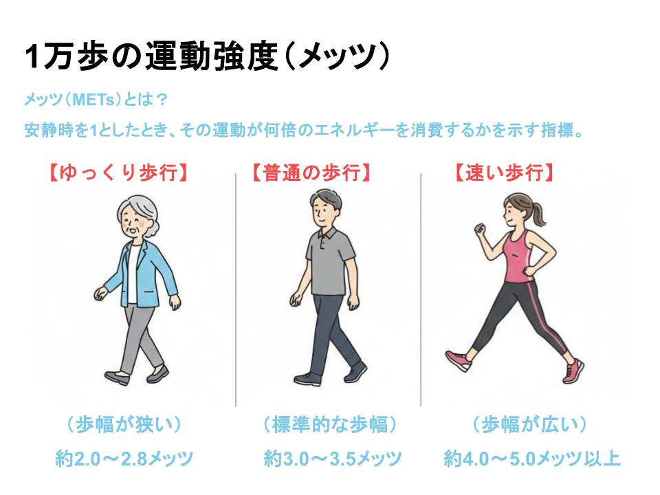 『1日1万歩』は、自立した生活を守るための立派なリハビリです。ですが、トレーニングとしてはどうでしょうか? 小股でトボトボと歩く1万歩は掃除機がけと同程度の強度(約3.0〜3.5メッツ)です。歩くことが困難な方や高齢の方には素晴らしい運動ですが、これだけでは筋肉を維持・向上させる「トレーニング」にはなっていないのが現実です。