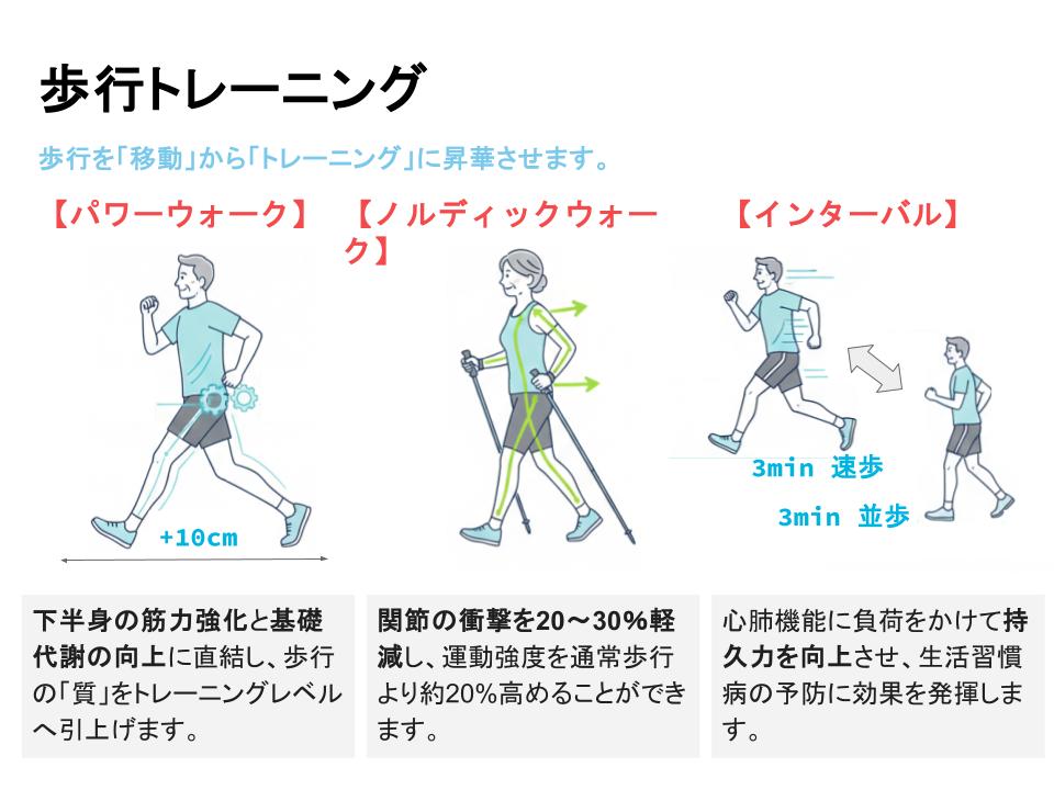 「3分速歩+3分並歩」の繰り返し。心肺機能に刺激を入れる。