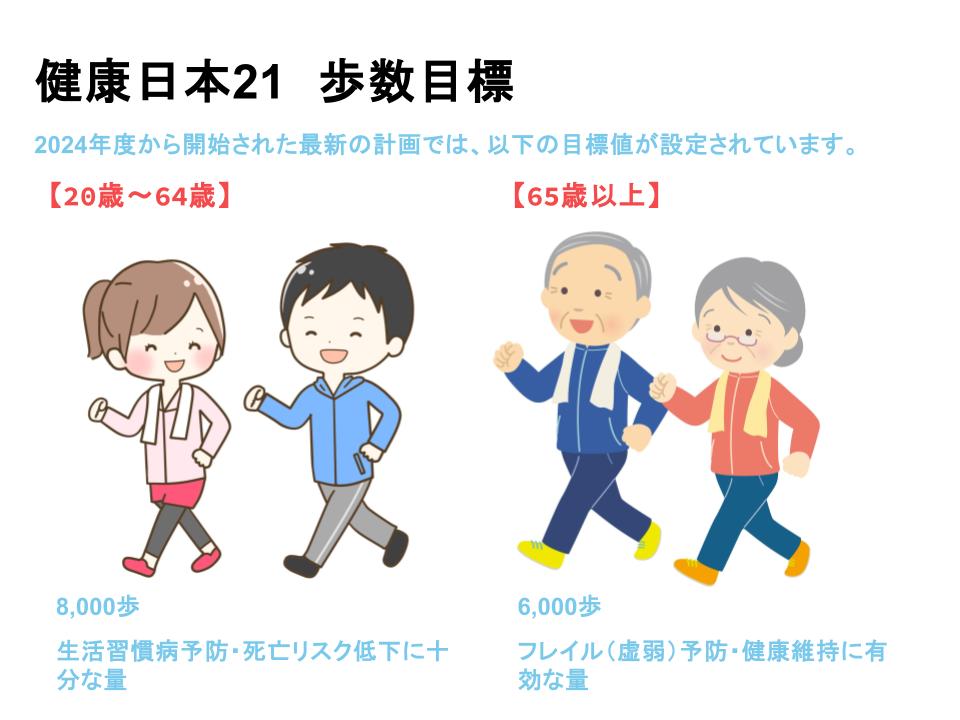 近年でも厚生労働省が中心となって進めている「健康日本21」でも数値目標として掲げられているように歩行は健康に重要とされています。