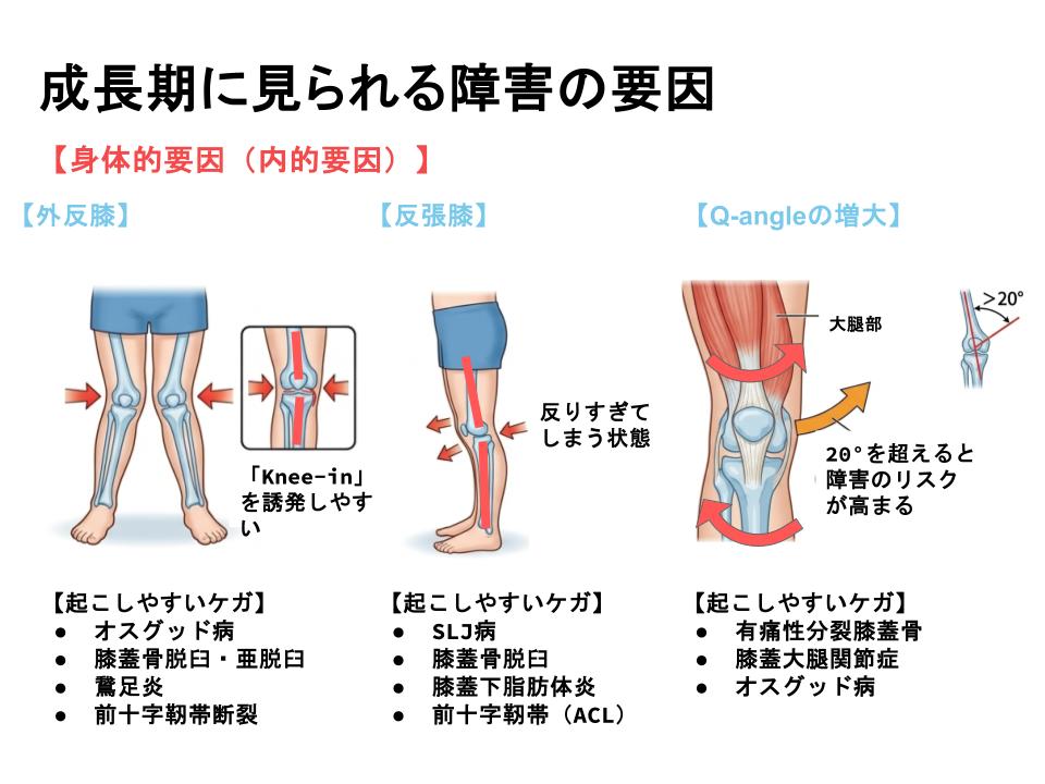 成長期の身体は成人よりも組織が厚く、柔軟性に富んでいますが、同時に力学的に脆弱でもあります。関節が緩すぎることで、生理的な可動許容範囲を超えた動きが生じやすく、靱帯損傷や半月板損傷などの「外傷」を引き起こす背景となります。