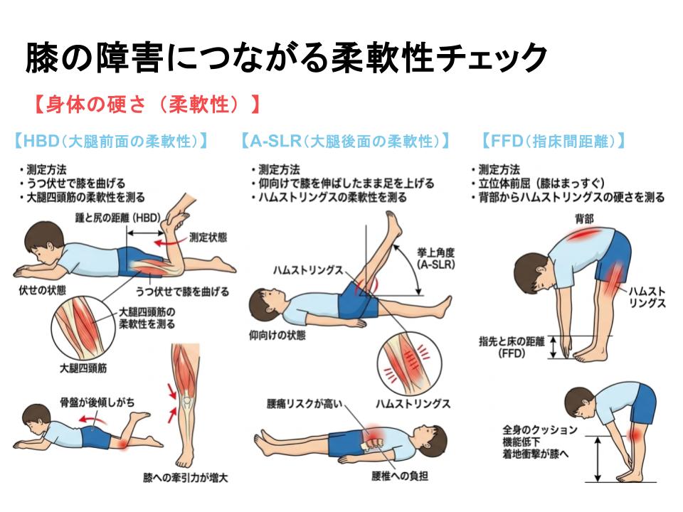 FFD(Finger Tip Floor Distance / 指床間距離): 立位体前屈で、指先が床にどれくらい届くかを測ります。背部からハムストリングスにかけての硬さを示します。全身のクッション機能が低下しているため、着地の衝撃がすべて膝へダイレクトに響いてしまいます。