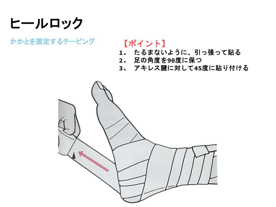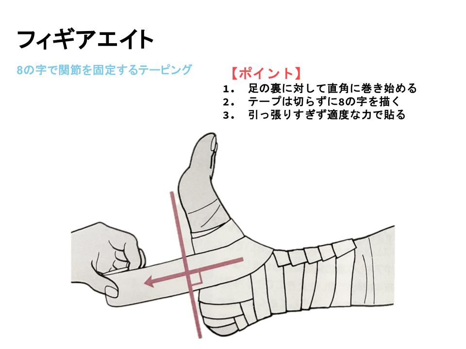 かかとを固定することで足首の安定性を高める巻き方です。足首からアキレス腱を通り、かかとの側面をたすき掛けのように斜めに巻き上げます。これにより、足首の不必要な動きを制限し、ねんざの予防に繋がります。
