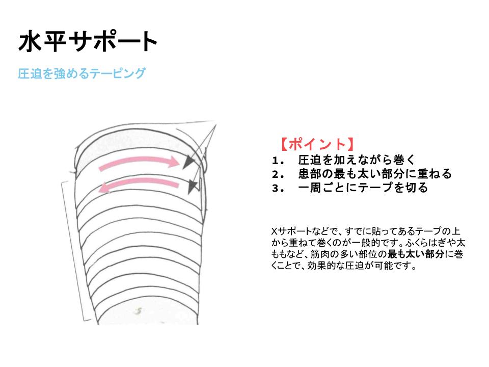 主に患部への圧迫を強めるために、Xサポートの上から横方向に重ねて貼る方法です。ふくらはぎや太もも、腰など、筋肉の多い部位でよく使われます。