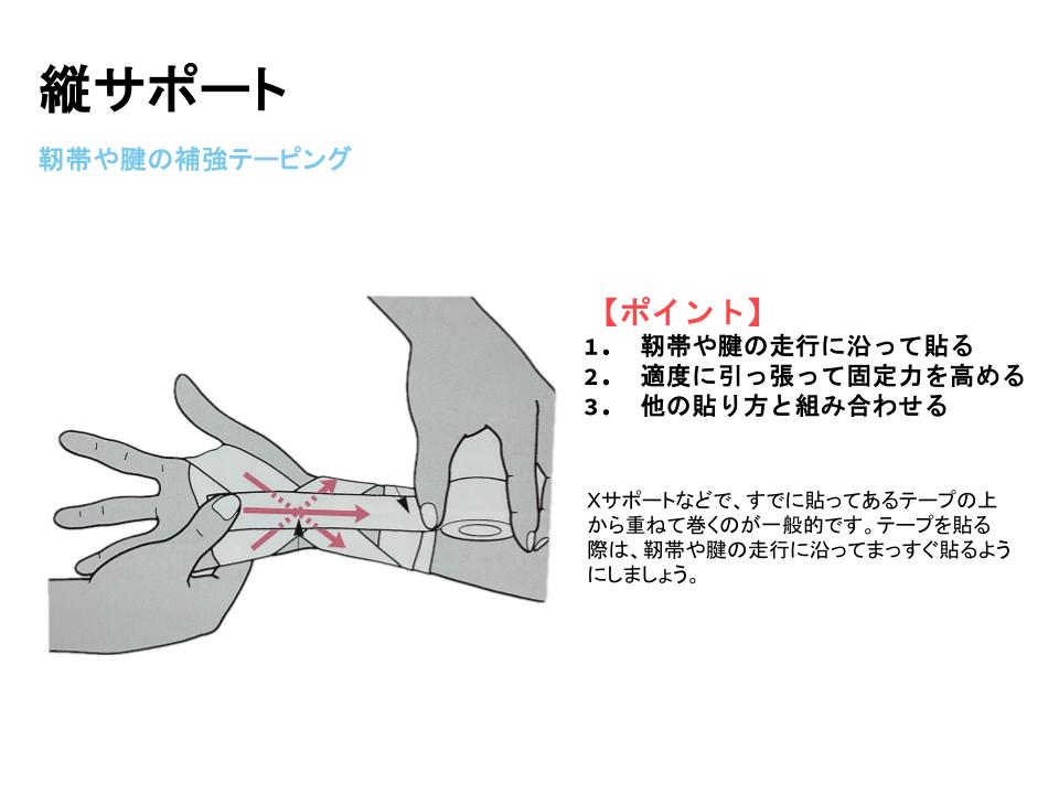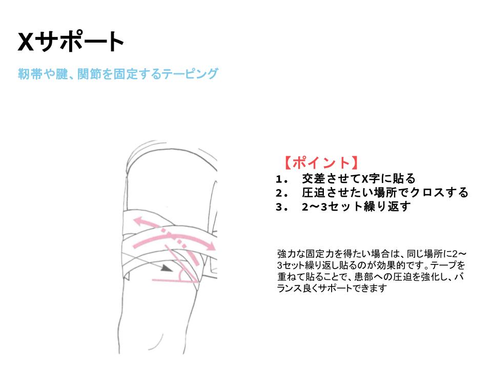 靭帯や腱の走行に沿って、縦方向に貼る方法です。主に上下方向や直線的な動きを制限します。補強力を高めたい時は、テープを強く引っ張って貼ることで、患部を固定できます。Xサポートと組み合わせて貼ることも多いです。