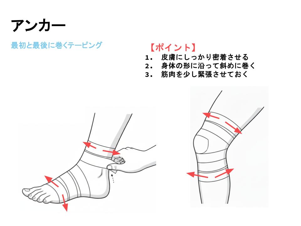 アンカーテープとは、テーピングの最初と最後に巻くテープのことで、他のテープのズレや剥がれを防ぎ、固定力を高める役割を果たします。これが適切にできていないと、テーピング本来の機能が失われてしまうほど、重要な土台となります。