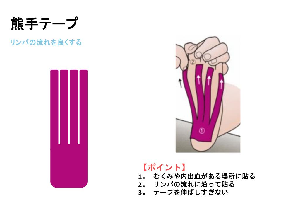 テープを熊手のように細かく切り、リンパの流れを良くする目的で使われます。むくみや内出血がある場所に貼ることで、余分な水分(リンパ液)の排出を促します。