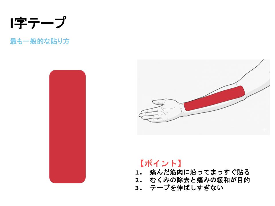 最も一般的な貼り方です。シンプルな貼り方です。テープをまっすぐな一本のまま、急性期(ケガをして間もない時期)の痛んだ筋肉に沿って貼ります。主な目的は、むくみや腫脹の軽減や痛みを和らげることです。