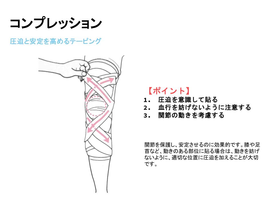 テーピングで患部を圧迫し、関節のぐらつきを防いで安定させる方法です。サポートテープと似ていますが、より強い圧迫で関節をしっかりと守ることを目的としています。伸縮性のあるテープを使い関節を囲むように圧迫を加えながら巻きつけます。これにより、膝関節を安定させ、ランニングやジャンプ時の負担を軽減できます。