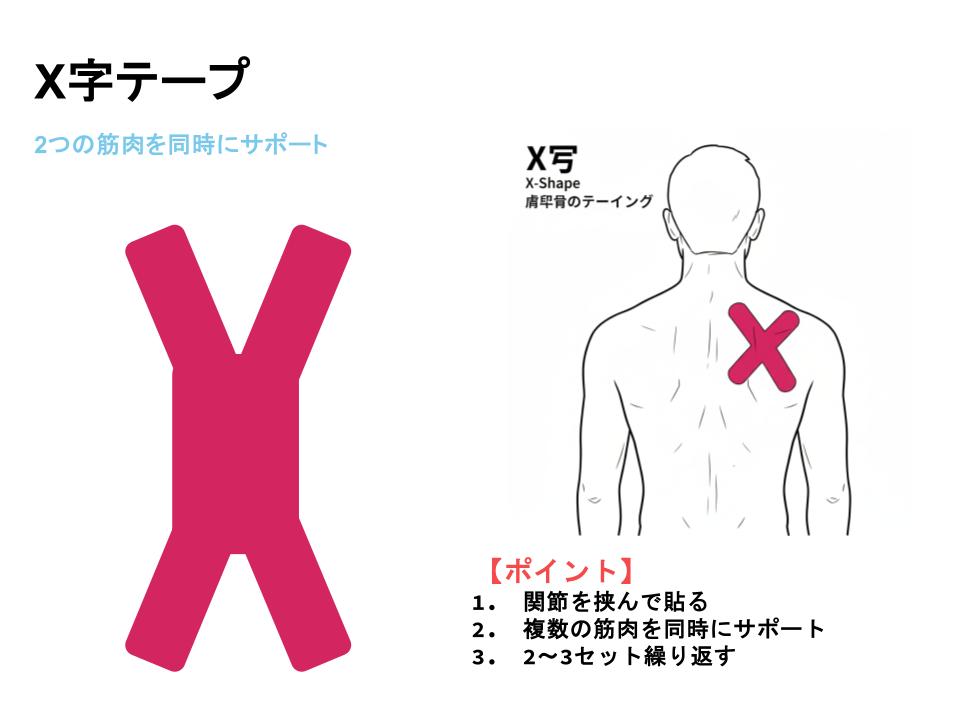 関節をまたいで、2つの筋肉を同時にサポートしたい場合や、菱形筋のように複雑な動きをする筋肉に使われる方法です。テープをXの字に切り、関節をはさむように貼ることで、広範囲にわたるサポートが可能です。