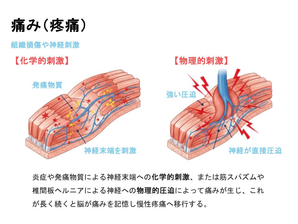 【物理的刺激】 筋スパズムによる強い圧迫や、硬くなった関節、椎間板ヘルニアなどによって神経が直接圧迫され、しびれや鋭い痛みを発生させます。痛みが長く続くことで、脳が痛みを記憶する慢性疼痛へ移行するリスクも生じます。