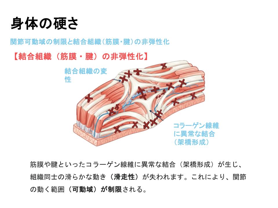 可動域の低下は、単に筋肉が短いだけでなく、結合組織(腱、靭帯、筋膜)の構造的な変性を示します。