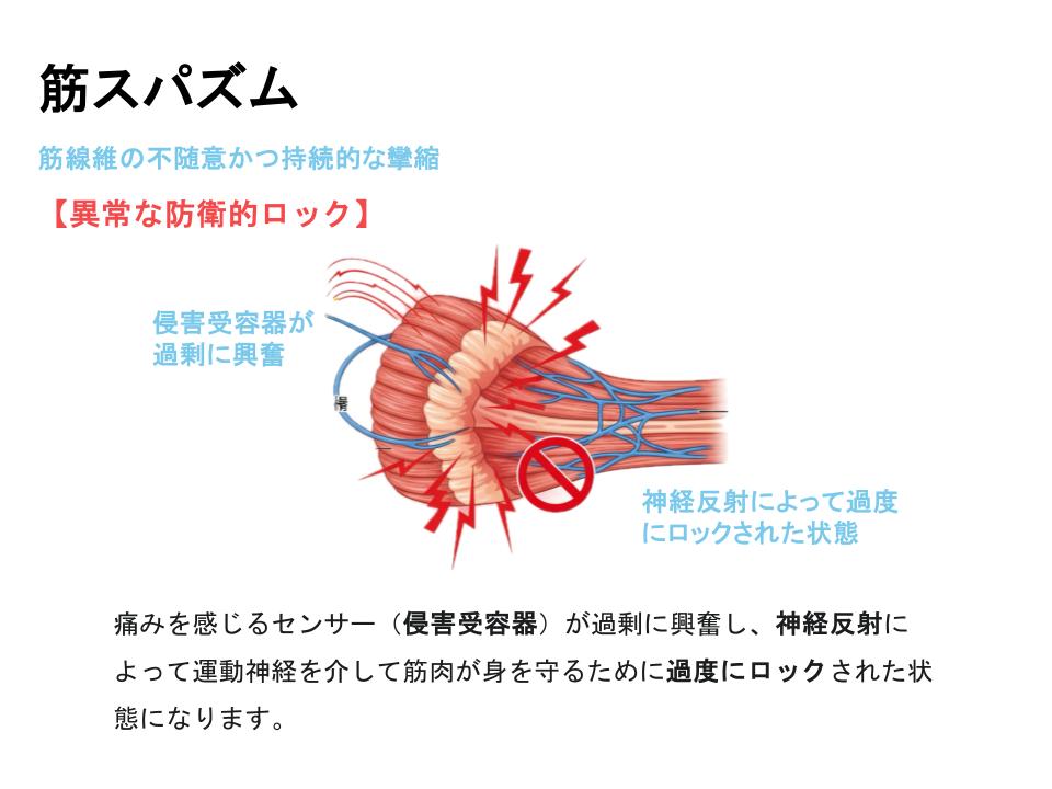疲労の限界、急激な体勢の変化、強い冷えによる血流遮断、椎間板の軽度な異常によって強いコリや急激な外力(過負荷)により、痛みを感じるセンサー(侵害受容器)が過剰に興奮します。この興奮が神経反射によって運動神経を介して筋肉に伝わり、筋肉が身を守るために過度にロックされた状態になります。血流は完全に阻害され、痛みによる収縮と収縮による痛みが続く悪循環が発生します。